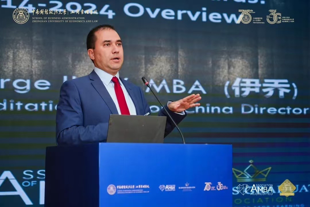 AMBA&BGA创新总监和认证总监George Iliev介绍了AMBA和BGA近十年奖项的设置,以及对商学院如何获得这些认证奖项的建议,并特别表扬了广外商学院极具特色的SMILE价值观。