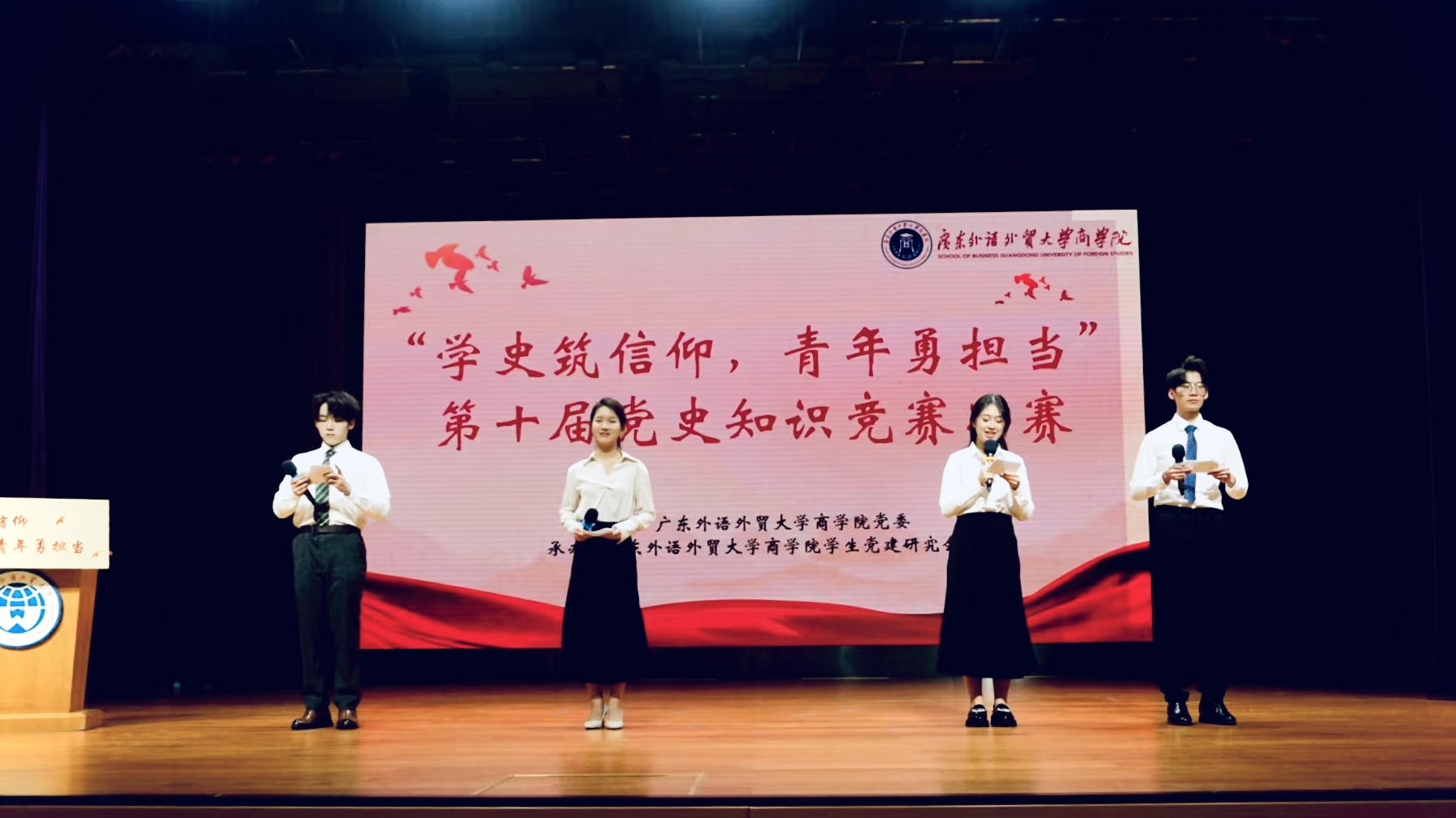 为筑牢青年学生的信仰之基,助力青年学生担当新时代赋予的重任,11月29日,商学院在大学城校区B8学术报告厅举办“学史筑信仰,青年勇担当”第十届党史知识竞赛决赛。商学院党委副书记沈长霞、经贸学院组织员王智聪、金融学院党建服务中心指导老师林路行、商学院全体辅导员出席本次活动,现场学生观众超300人。