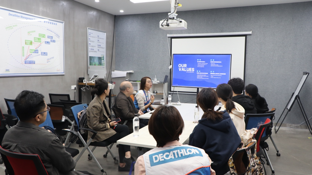 迪卡侬南区人力资源经理陆嘉欣、广州区域副总经理蒋文琪等热情接待商学院一行。活动伊始,迪卡侬工作人员带领我院师生参观了广州洛溪门店的店内环境和实践场所,详细介绍了迪卡侬的产品线、销售策略等。迪卡侬作为全球知名的体育用品品牌,其全产业链的经营模式和不断创新的产品理念,为商学院师生提供了丰富的学习资源和实践机会。