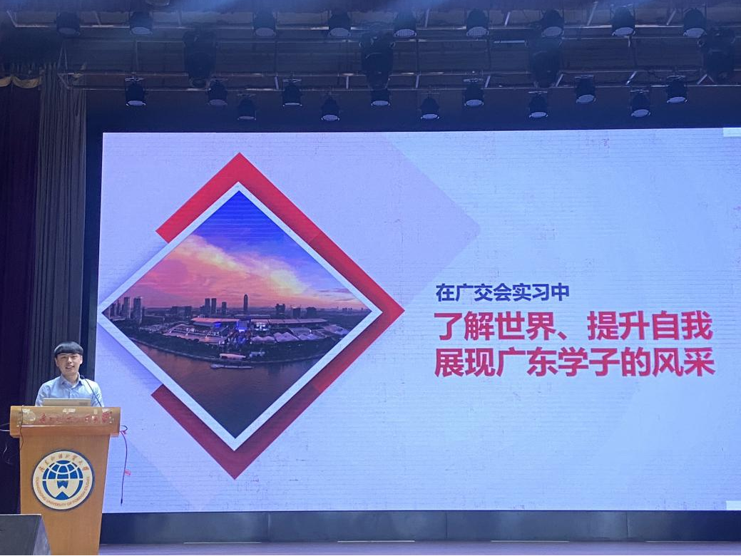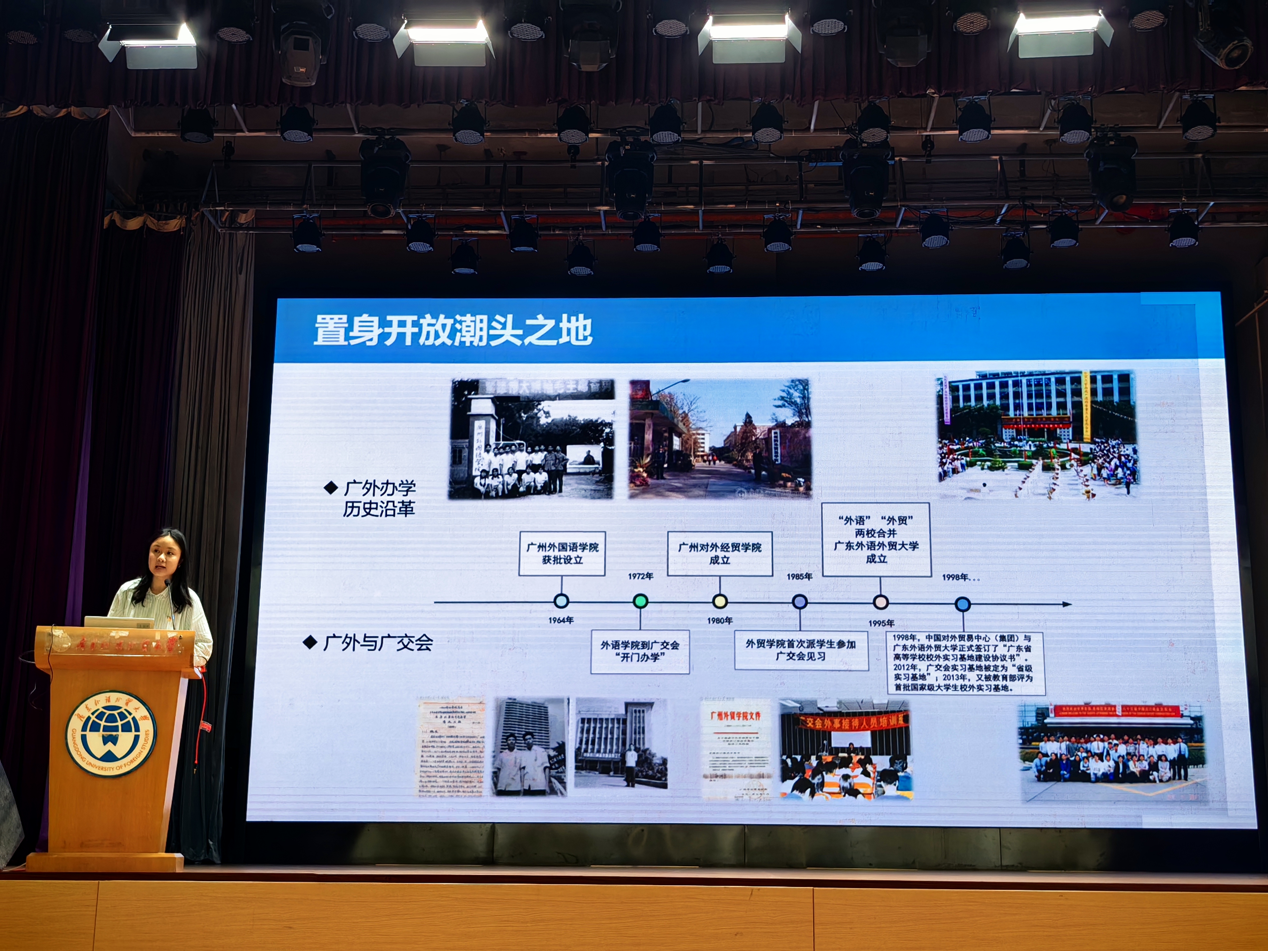 紧接着,罗毅颖以《一起做改革开放的弄潮儿——广交会与广外青年的时代责任》为主题向在座的学生们上了一堂精彩的思政课。她以广交会的发展历程与广外的发展变革为脉络,生动阐述了广交会初创时期的艰辛以及广外学子为中国对外贸易事业所作出的杰出贡献。这不仅让学生们对广交会历史有了更深刻的理解,更加深了他们对广外商科青年所肩负的使命与责任的认同。