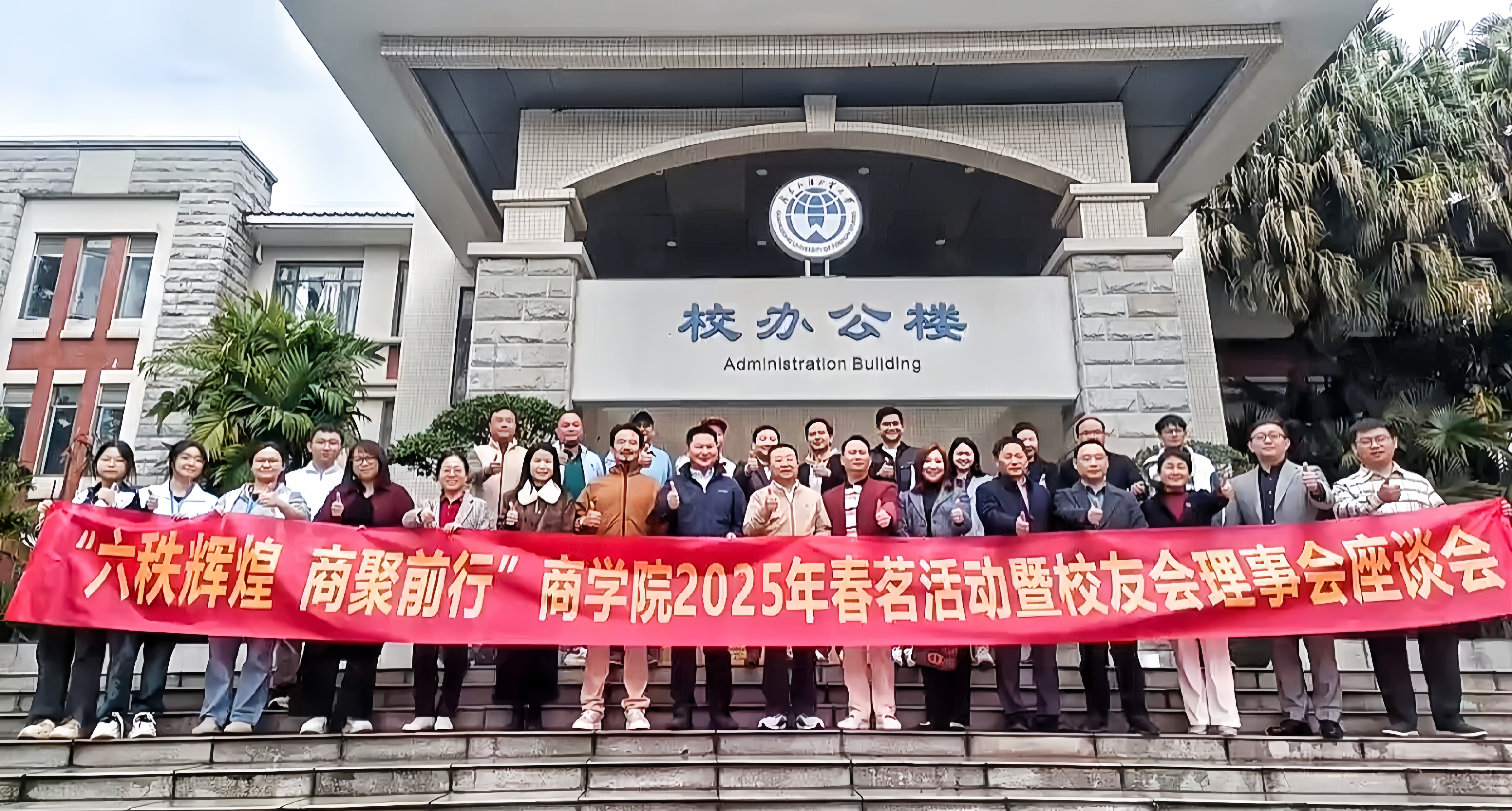 为庆祝广东外语外贸大学成立六十周年,进一步增进校友与母校的交流与联系,凝聚校友力量,推动学院高质量发展,2025年3月29日,商学院在大学城校区第一会议室举行“六秩辉煌,商聚前行”2025年校友春茗暨校友会理事会会议。商学院党委书记肖锋、副院长(主持工作)袁登华、原院长朱文忠、党委副书记沈长霞、创新创业学院副院长刘方龙、商学院校友会执行会长林明校友、商学院第三届校友会理事会成员、校友代表及师生代表出席活动。