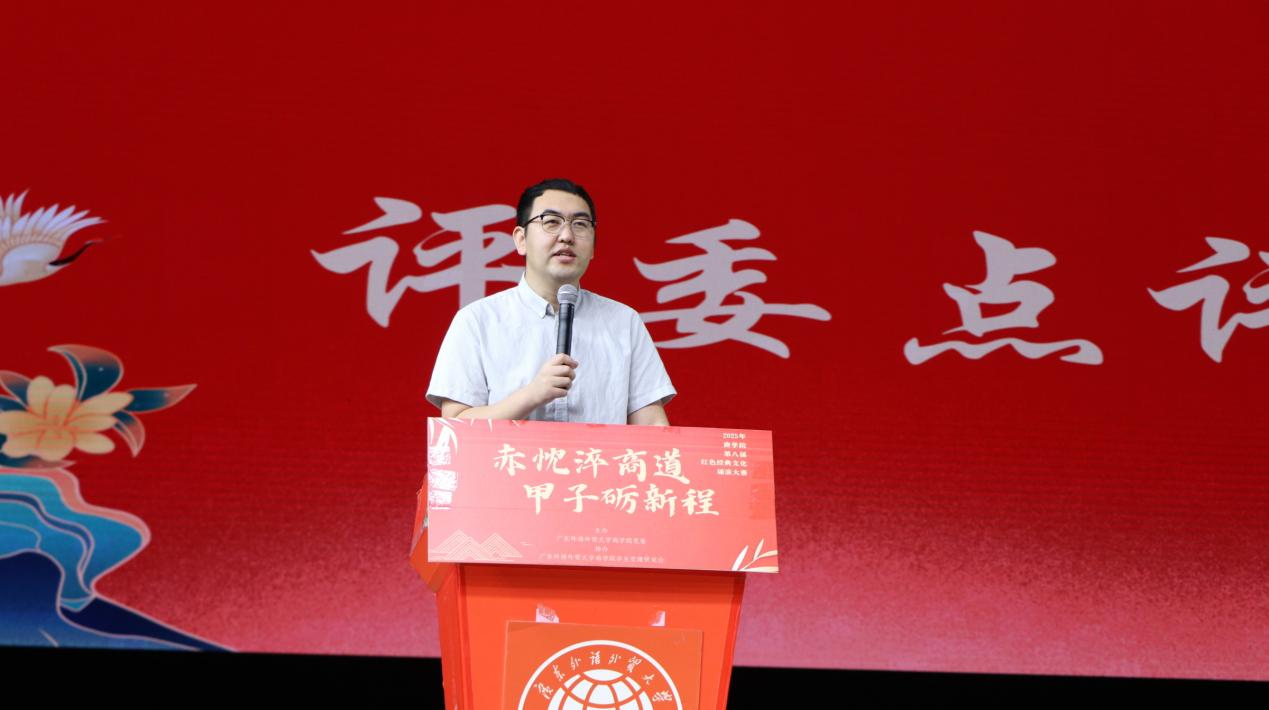 接着,薛达对比赛进行点评。他强调本次大赛意义重大,参赛作品具有引领力、感染力和创新力,为传承红色文化搭建了有效平台。参赛者通过精彩诵演,生动再现革命先辈故事,将其与校史、中国商道有机结合,让红色文化在新时代焕发光芒。