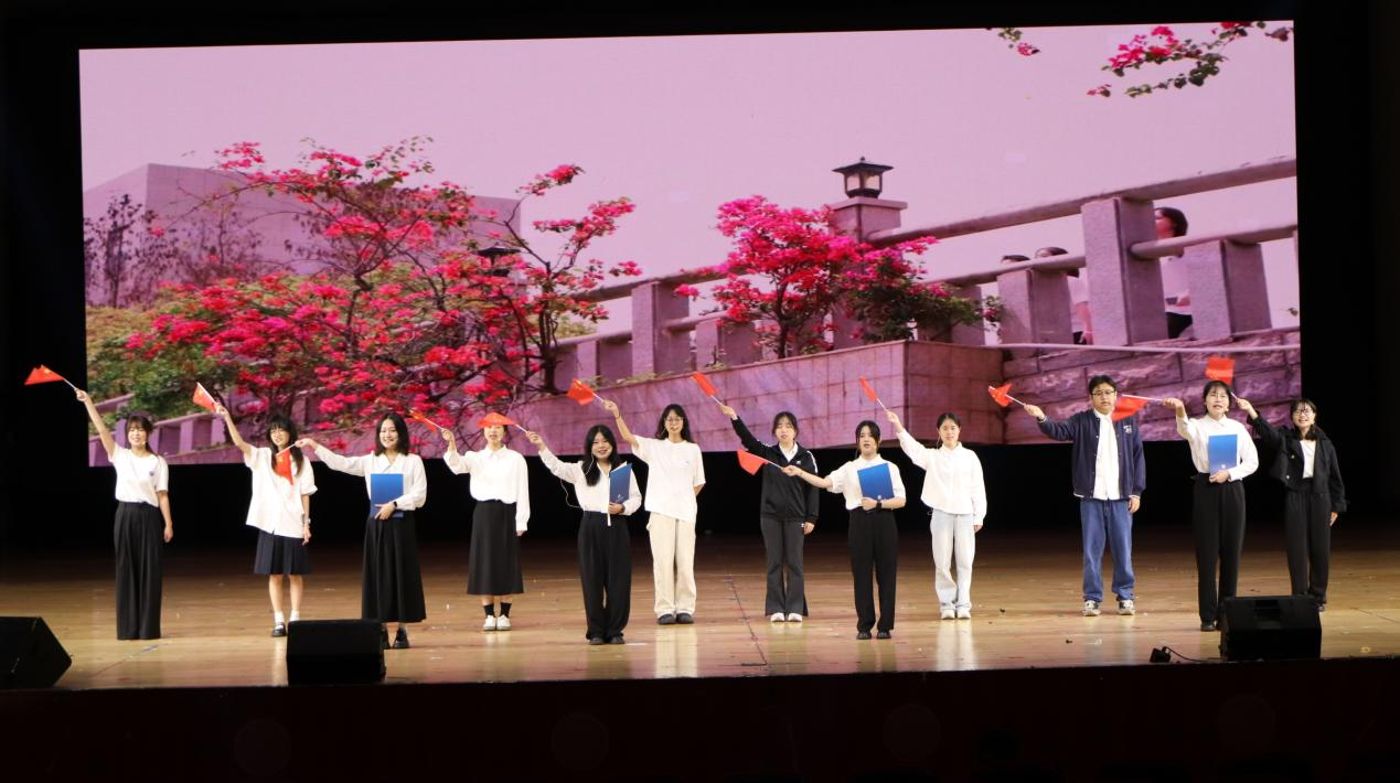 4月11日,商学院第八届“赤忱淬商道,甲子砺新程”红色经典文化诵演大赛在大学城校区大会堂举行,以红色诵演致敬抗战胜利八十周年,献礼母校六十华诞。机关党委六级组织员宾锐光、校团委副书记薛达、马克思主义学院形势与政策和社会实践教学部主任邓晶晶、商学院党委组织员秦雨担任评委,商学院党委书记肖锋、副书记沈长霞及辅导员出席活动。