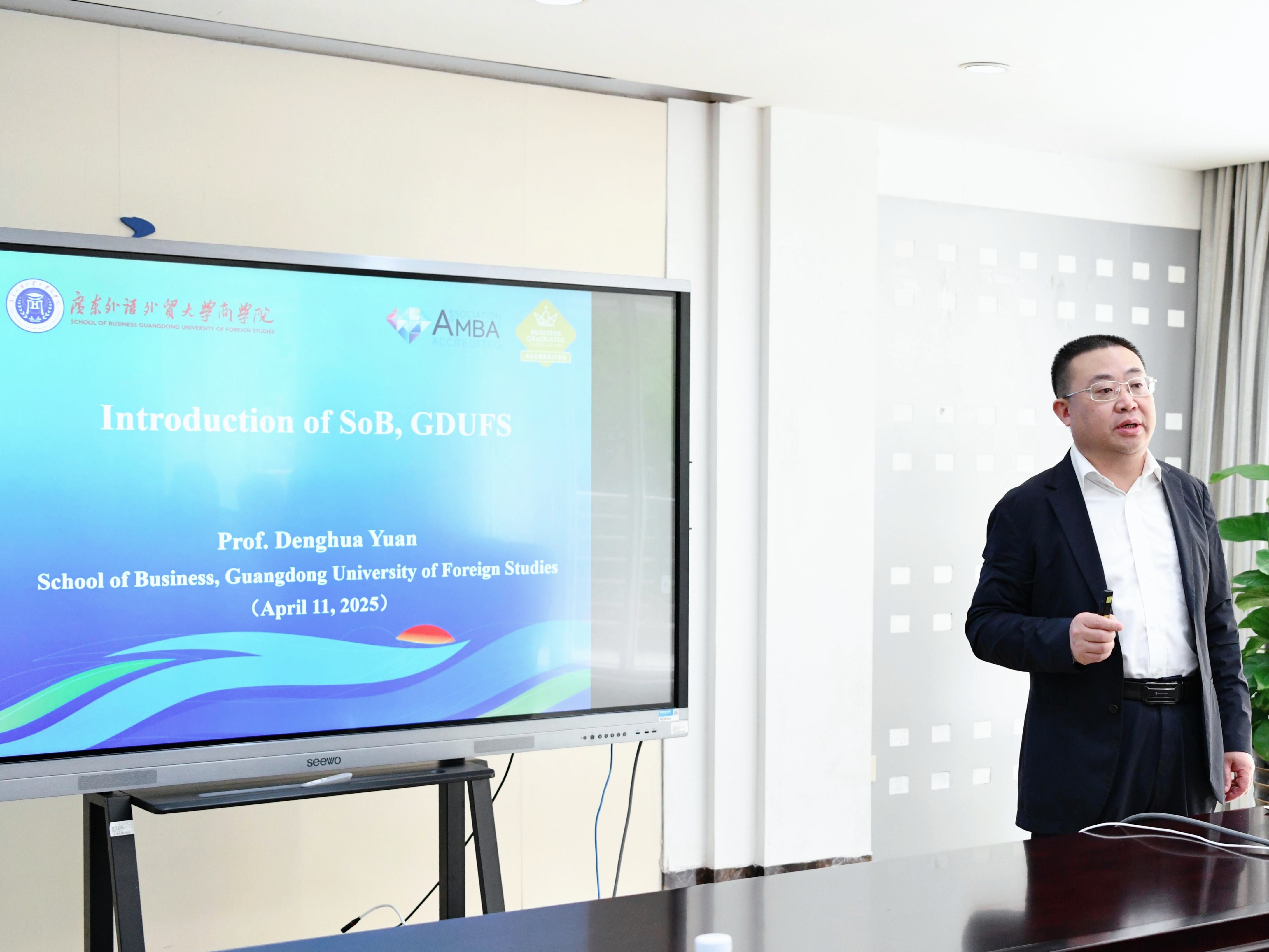袁登华介绍了商学院的发展历程、师资队伍、国际化内涵等基本情况,并重点分享了学院“全球视野、中国商道”的办学定位,“培养国际高端商科人才”的办学使命, “社会责任、尊重包容、正直诚信、知行合一、创业精神”的SMILE价值观,以及围绕 “国际化”PRIME战略和“数字化”DIGITAL战略所采取的举措。