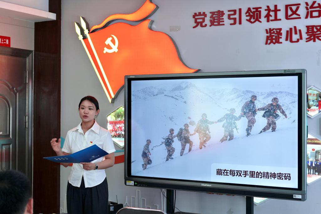 随后,人资第一学生党支部的胡叙妍同学以“聚沙成塔铸铁军 星火燎原启新程”为题讲授党课。她先带领师生党员回顾中共三大历史,结合雪域高原巡逻的亲身经历和趣味小游戏,带领大家体验到伟大团结精神的力量。接着,胡叙妍借库尔班大叔一家的故事、张伯苓 “爱国三问” 等,从把握历史传承基因、领会实践要求、践行时代使命等三个方面,讲解如何理解伟大团结精神。她强调党员要做团结的践行者和先行者。最后,胡叙妍呼吁全体师生党员以团结为矛、担当为盾,让三大会址的精神之光指引前行,为实现中国梦拼搏奋进。