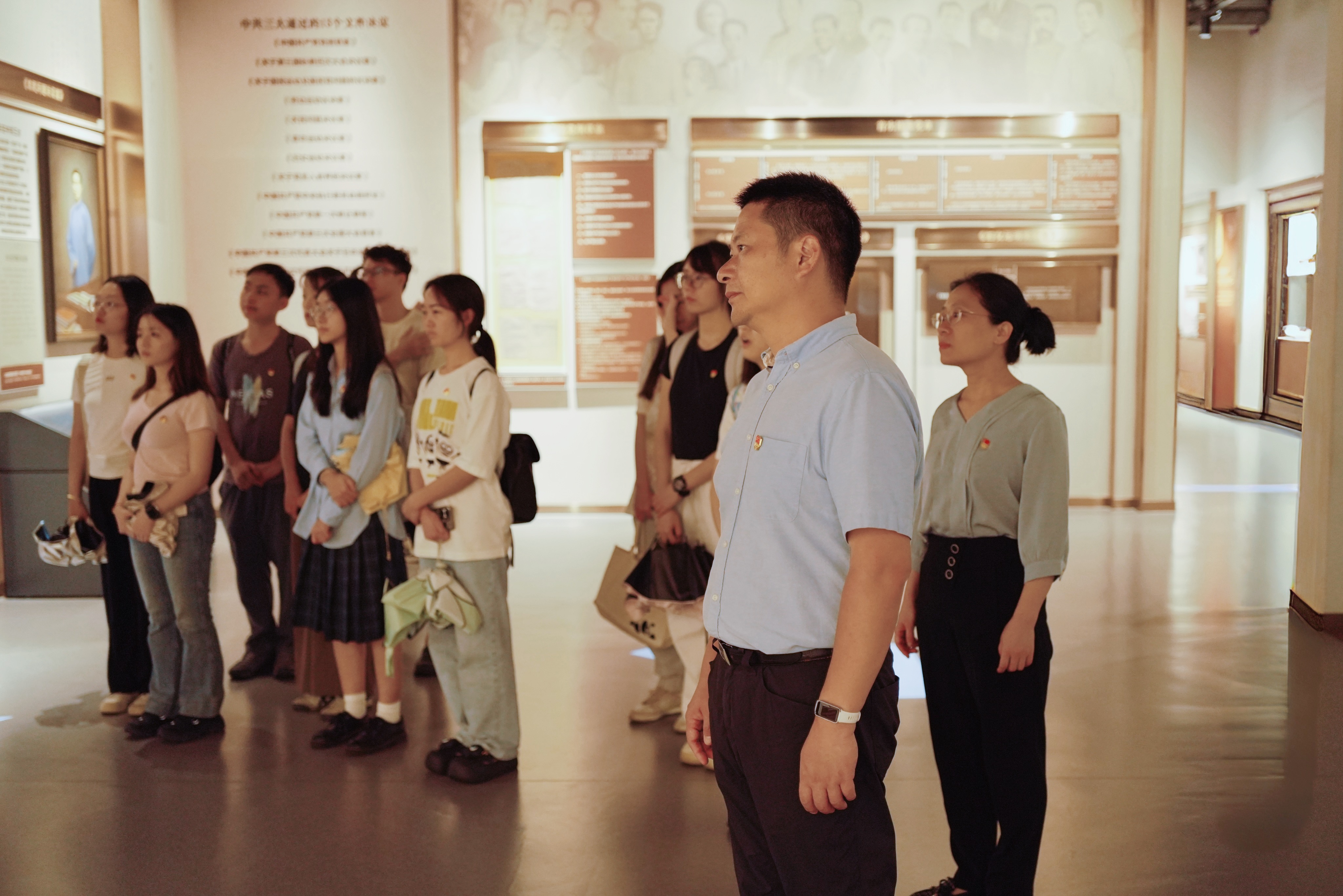 踏入中共三大会址纪念馆,师生党员们仿佛穿越时空,置身于一百多年前那段波澜壮阔的革命岁月之中。馆内陈列着的一件件珍贵文物,一张张泛黄的历史照片,以及通过现代信息技术还原的沉浸式场景,生动再现了中共三大召开时的情景。师生们驻足凝视泛黄的文献资料,学习中共三大精神,深刻感悟党在关键历史节点的战略抉择与使命担当。