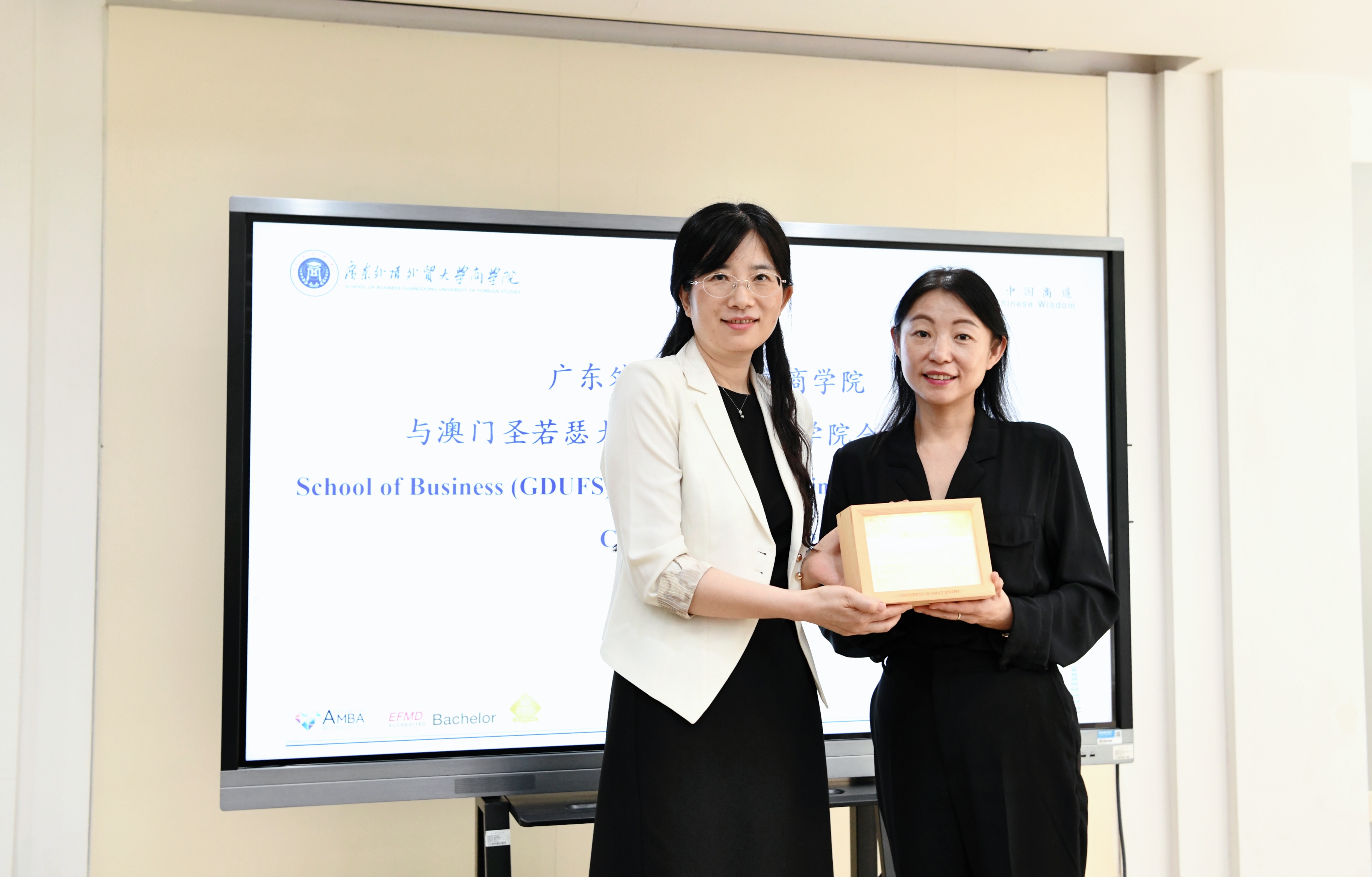 在自由交流环节,圣若瑟大学商学及法律学院一行对广外商学院的国际化办学成果表示欣赏,并表达了在多个领域开展合作的强烈意愿。双方围绕港澳“万人计划”的申报和实施、学生联合培养、学术合作研究以及联合工作坊等展开深入探讨,并达成多项共识。
