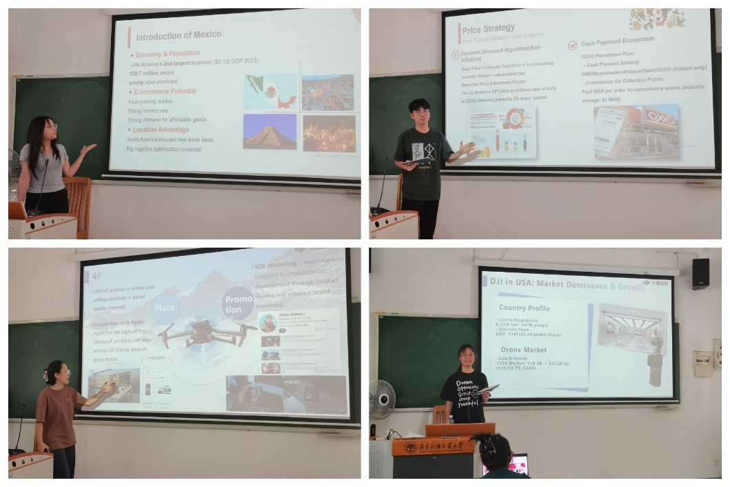 在研学过程中,学生以小组为单位进行跨文化模拟演练,为中国企业进入国际市场设计符合目标国文化的营销方案,涵盖PEST分析、4Ps策略与风险评估,培养实战能力。研学小组对TEMU进驻墨西哥、Anjoy Foods(安井集团)开发新西兰、蜜雪冰城渗透印尼市场、Flower Knows(花知晓)出海越南、DJI(大疆)拓展国际市场等案例展开探讨,最后以英文答辩形式进行成果汇报。通过英文案例分析、商业报告撰写、小组汇报与答辩、相互评估和建议,学生们一步步突破语言障碍,锻炼了直面国际竞争的能力与勇气。这种学、用、创结合的教学设计,不仅强化了市场营销专业的国际化特色,也为后续课程改革提供了范本。