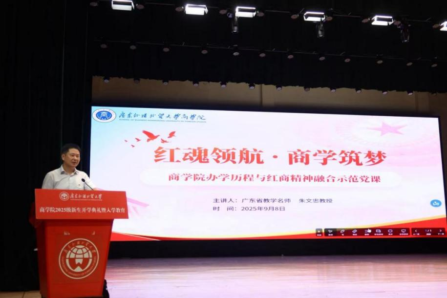 2025年9月8日,商学院在大学城校区大会堂举行“红魂领航·商学筑梦”——商学院办学历程与红商精神融合示范党课。本次活动作为2025级新生入学“必修课”,由老党员、广东省教学名师、商学院原院长朱文忠教授主讲。本次党课聚焦商学院办学历程与红商精神的深度融合,旨在引导新生筑牢理想信念、明确使命责任,为培养新时代高质量商科人才奠定思想基础。商学院党委书记肖锋、副书记沈长霞、新生辅导员及全体新生共同参与。