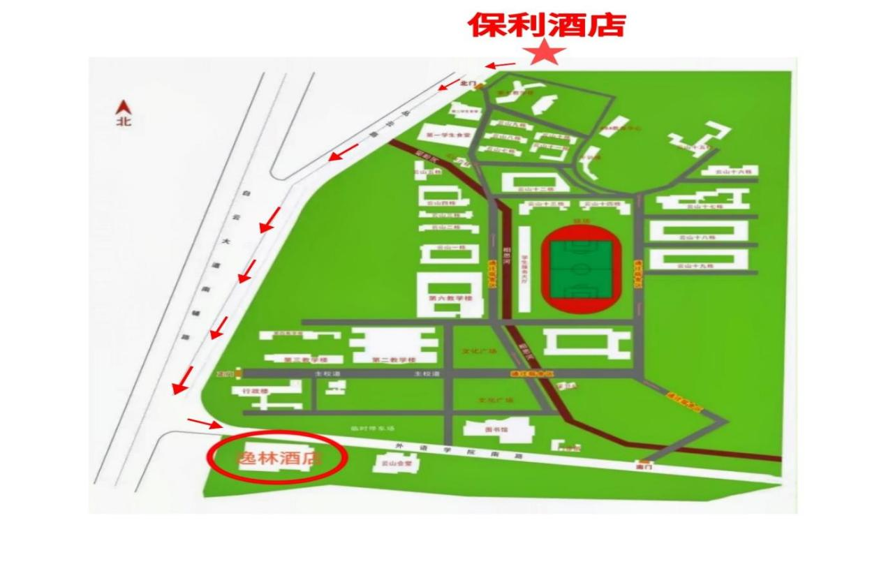 广东外语外贸大学白云山校区附近的广州逸林假日酒店(主会场逸林酒店牡丹厅)、广州保利山庄酒店。