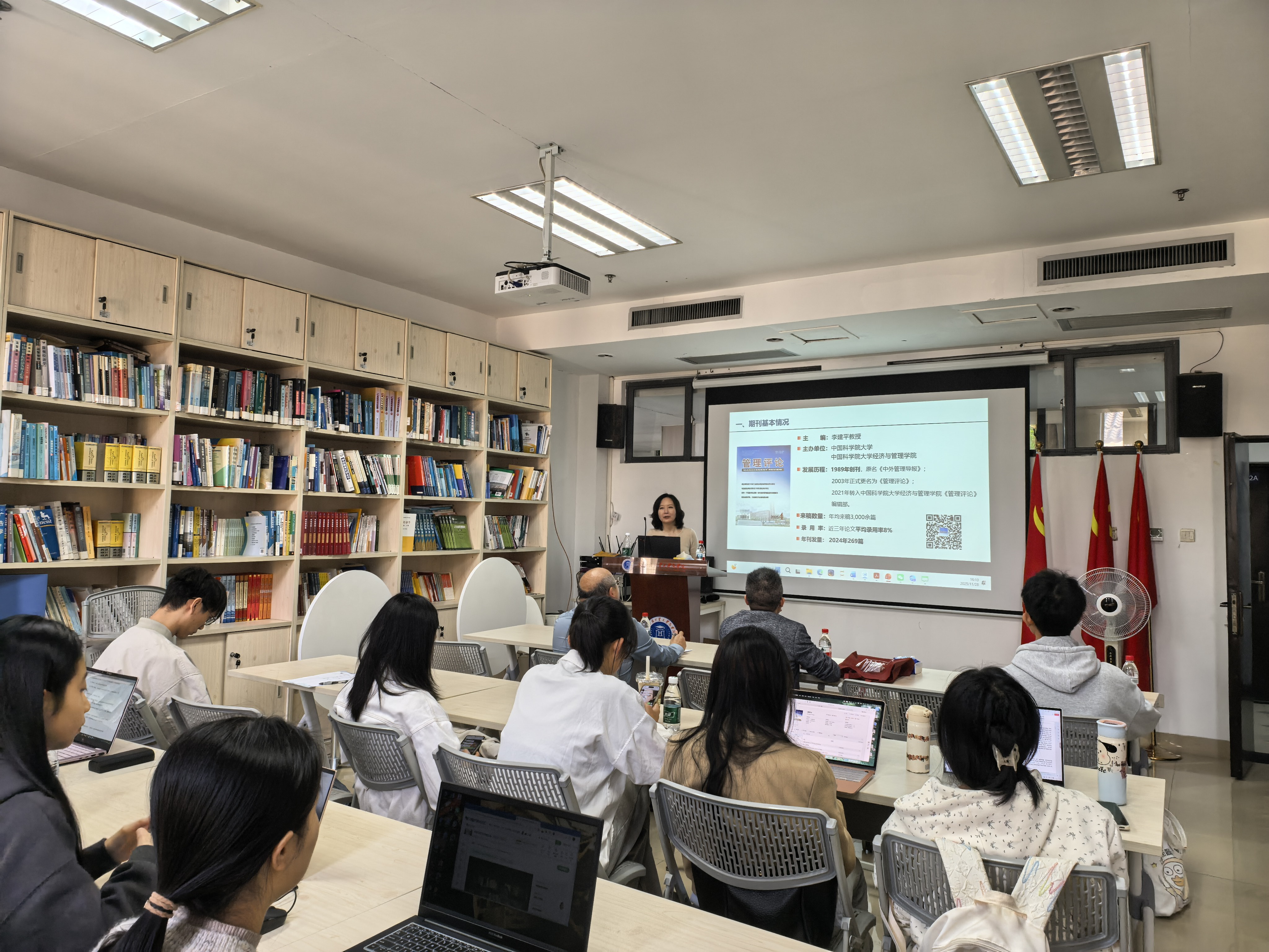 随后,张思结合《管理评论》的审稿实践,为师生深入解析了提升投稿成功率的关键要点。她以“时间密码”与“细节陷阱”概括投稿中最容易被忽视的因素:每年3月与年末为投稿高峰期,也是“高拒期”,建议作者尽量规避;而周二作为编辑处理稿件效率最高的时间窗口,被视为“一周中的黄金投稿日”。在谈到投稿常见误区时,她特别强调参考文献规范性的重要作用,指出中文期刊投稿需确保至少半数中文文献,过度使用陈旧外文文献或低水平期刊文献,均可能直接导致退稿。她还提醒作者充分利用投稿备注栏,清晰呈现研究创新点,避免因信息缺失影响编辑判断。