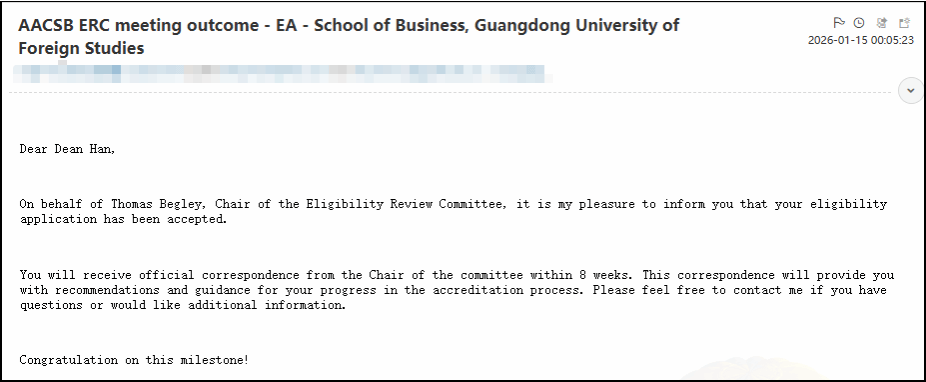 近日,学院接到国际高等商学院促进会(AACSB)资格评审委员会通知,宣布我院AACSB的认证资格申请EA(Eligibility Application)顺利通过。这标志着我院的发展战略、组织架构、教学质量保障体系等已符合AACSB的核心标准与基本原则,学院AACSB认证取得了阶段性重要进展。