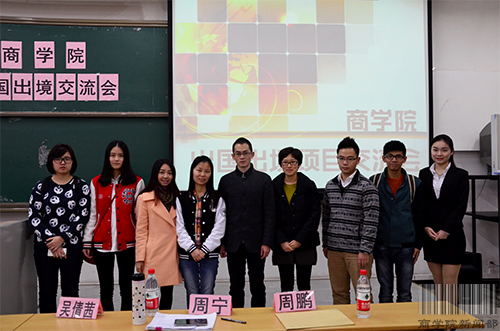 本网讯(文:陈彦彤 图:刘珩)3月12日下午3:00,商学院出国出境项目交流会在教学楼C308举行。出席本次交流会的嘉宾有广东外语外贸大学国际合作与交流处国际项目科科长周鹏、我院外事协调员周宁、办公室老师曹逸寒、教务办老师吴倩茜、团委书记李晟,学院11级参加交换生项目的物流管理专业学生李阳、薛亦婷、徐嘉雯。