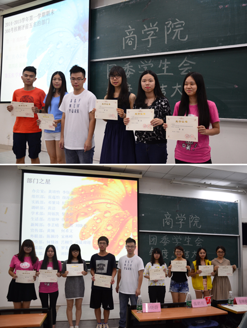 本网讯(文:张楠 图:林杰铃)526日晚7点,我院团委学生会年度总结大会在教学楼F315拉开序幕。出席本次大会的嘉宾有团委书记李晟,团委副书记谢珮,学生会主席俞映庭,学生会副主席陈欣欣、卢梓昊、张君亮,办公室主任冯晓蔚。本次大会共有四项流程,分别为各部门总结、公布2015年度360考核测评前五名部门、公布2015年度部门之星以及商学院团委副书记谢珮致辞。