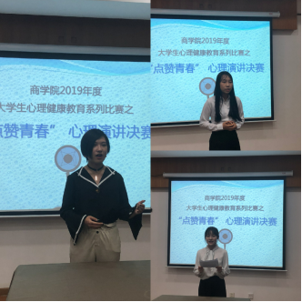 本网讯 (文:张晓霞 图:张旭婕):2019年4月11日下午4时,学商学院2019年度大学生心理健康教育系列比赛之“点赞青春” 原创心理演讲决赛在南校区院系楼349举行。出席本次演讲比赛的评委有:商学院党委副书记沈长霞、商学院团委书记杨欣老师、学工办杨柳老师。