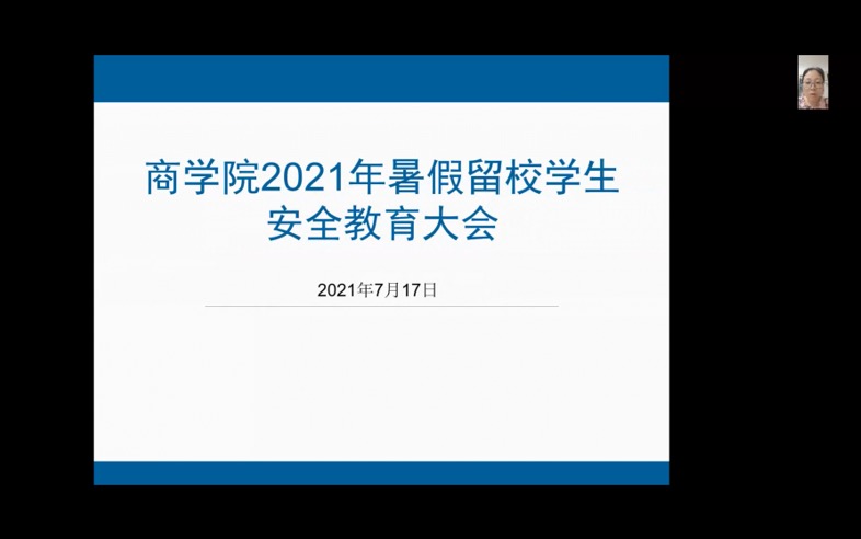 为提醒留校同学树立安全观念、提高安全防范意识,确保留校同学在学校度过一个平安、充实、愉快的假期,7月17日下午,商学院党委副书记沈长霞带领辅导员一行走进学生宿舍,关心留校学生。当日晚,商学院在线上召开暑假留校学生安全教育大会。沈长霞、全体辅导员和留校学生参加会议。会议由辅导员张哲主持。