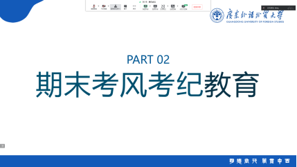 诚实守信是中华民族的传统美德,也是为人处世的重要品质。在年级大会上,各年级辅导员详细讲解了《广东外语外贸大学学生违纪处分规定》中关于考试违纪作弊的条款,通过警示案例提醒同学们恪守诚信,自觉遵守考试纪律,杜绝考试违纪、作弊等行为,努力营造遵纪守法、严谨自律、诚实守信的良好氛围。会上,各年级辅导员作期末考试动员并向全体同学发出倡议,鼓励同学们珍惜时间,积极备考,满怀信心地迎接考试,为自己交出一份优秀的诚信答卷。除此之外,学院还通过在官网、官微等平台发布《诚信考试倡议书》,组织全体同学签署诚信考试承诺书等方式,实现了考风考纪教育的全覆盖。