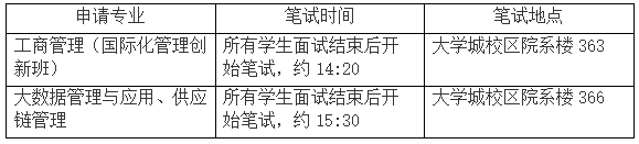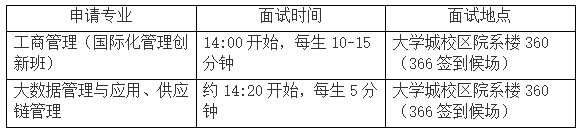 申请创新班专业每生10-15分钟(请准备5分钟英文自我介绍);申请大数据管理与应用、供应链管理专业每生5分钟(请准备2分钟中文自我介绍);所有专业面试地点位于院系楼360,请先在院系楼366签到候场,面试顺序详见附件。