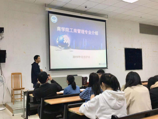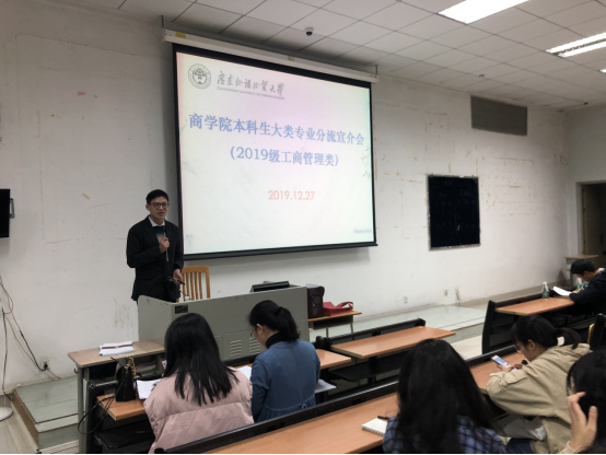 2019年12月27日18时30分,商学院本科生工商管理大类专业分流宣介会在南校区F栋208教室召开。商学院副院长丁浩、党委副书记沈长霞、市场营销专业系主任张红明、人力资源管理专业系主任安凡所、云山青年学者祝振铎、辅导员秦雨、辅导员张哲、国际认证主管冯雨晴、教务秘书卢文婕及2019级工商管理类学生200余人出席本次会议。