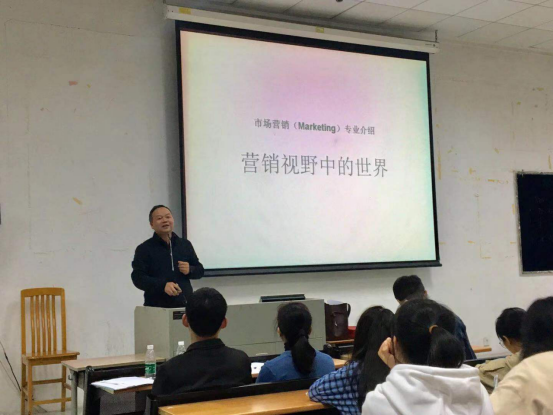 随后,参与大类分流专业的教师代表分别对各专业做了基本情况介绍。云山青年学者祝振铎老师向学生说明工商管理专业的基本情况,并介绍了专业优势和荣誉;市场营销专业系主任张红明主通过华为、江小白、“口红小王子”李佳琪等案例发表主题为“营销视野中的世界”的演讲;人力资源管理专业系主任安凡所运用图表数据和视频带同学们 “走进HR”,并与学生互动,现场气氛十分活跃。
