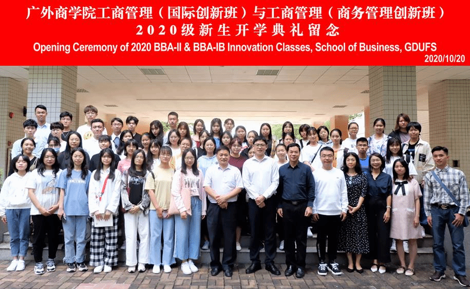 2020年10月19日下午,商学院工商管理(国际创新班)与工商管理(商务管理创新班)2020级新生开学典礼在南校区F104举行。商学院院长朱文忠、副院长丁浩,全英教学部主任黄磊、教师代表李楠、马秋卓、张蔼恒,教务办老师吴倩茜,2018级创新班学长代表朱子墨,2020级创新班全体同学出席典礼。典礼由丁浩副院长主持。