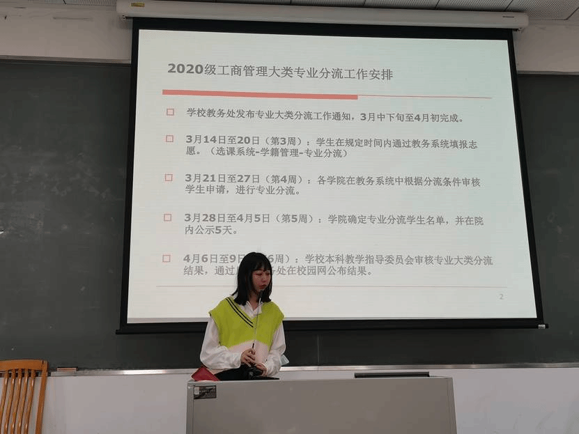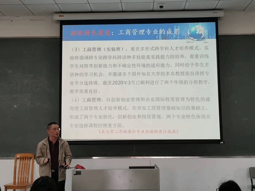 3月11日下午2点,商学院工商管理大类专业分流和转专业宣介会在教学楼G207召开。商学院教学副院长丁浩、党委副书记沈长霞、工商管理专业系主任孟丁、市场营销专业系主任张红明、人力资源管理专业系主任安凡所、教务秘书卢文婕出席宣介会。会议由副院长丁浩主持,商学院2019级、2020级本科生共300余人参加本次会议。