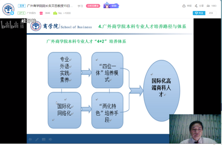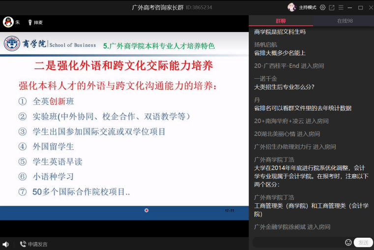 商学院招生宣讲会是广外招办和广外天河校友会联合举办的2020年广外招生宣讲会中的重要一场。在5月3日的宣讲会上,院长朱文忠以“选择商学院 成就国际高端商科人才”为题在QQ群课堂进行直播宣讲。5月15日,朱文忠院长以“走进广外商学院”为题在广外招办哔哩哔哩直播间进行宣讲,直播实时最高人气达2000多,取得了良好的宣传效果。