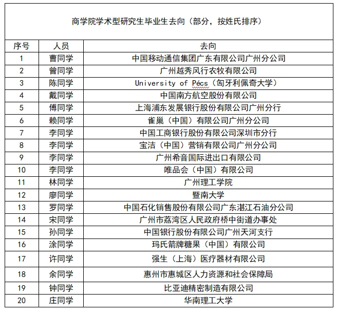 l 有相当一部分毕业生考入中国社科院、华南理工、暨南大学等高校继续深造。