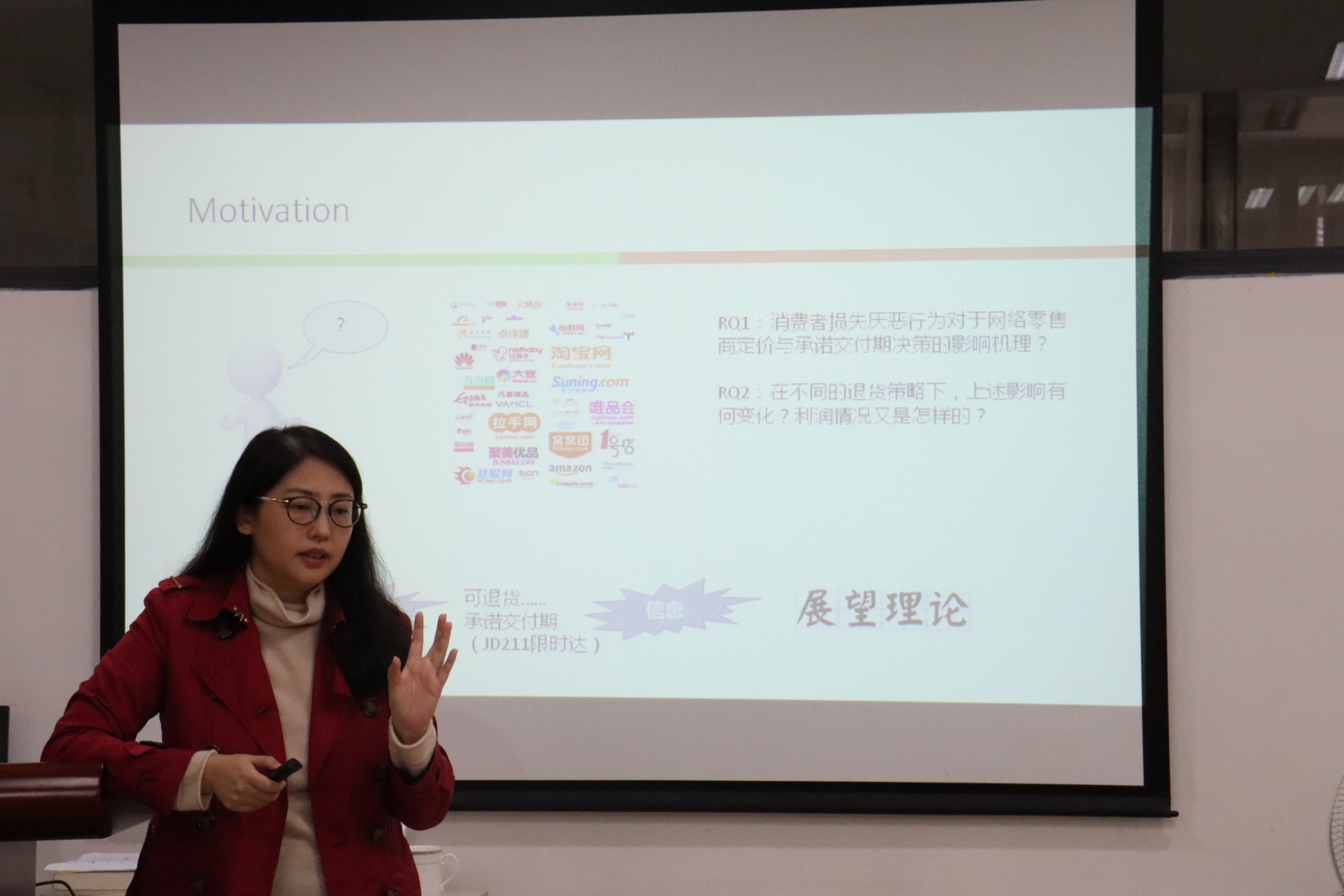 首先,赵思思老师为同学们分享题为《考虑消费者损失厌恶的网络零售商承诺交付期决策》的文章。随着互联网、电子商务与社交网络的快速发展,在线商品和服务的数量得到成倍增长,赵思思老师将研究聚焦于电商市场,主要探讨在考虑消费者损失厌恶行为之后的网络零售商定价与承诺交付期的联合决策优化问题,具体包括:(1)消费者损失厌恶行为对于网络零售商定价与承诺交付期决策有何影响及其机理如何;(2)在不同的退货策略下,上述影响将发生怎样的变化?其利润情况又是如何?