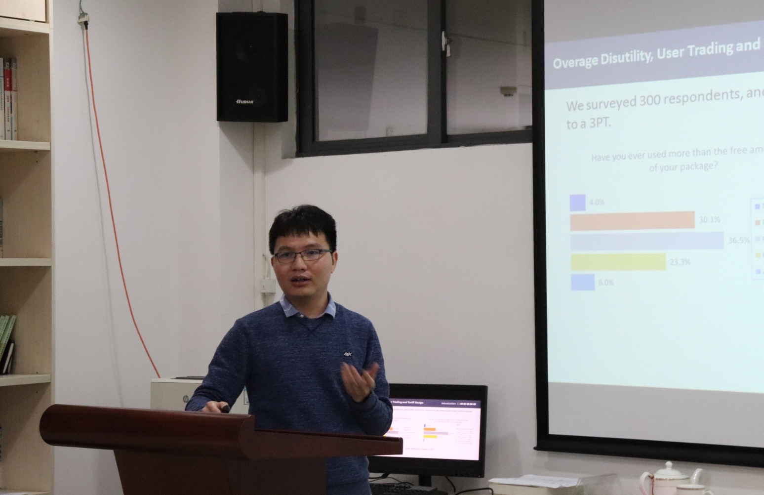 紧接着,黄伟祥老师为同学们分享题为《Overage Disutility, User Trading and Tariff Design》的研究。电信通讯行业正面临一个高度异质性的市场:特定套餐的用户在数据使用方面表现出非常多样化的消费模式,其中超过60%的低端计划用户使用50%甚至更少的限额;消费者在消费价格区间的选择上同样表现出巨大的异质性(低至2美元,高至70美元)。因此电信行业的定价方案远无法满足不同类别消费群体的需求。为此,部分电信企业为用户推出数据交易计划,允许用户交易自身的数据额度。