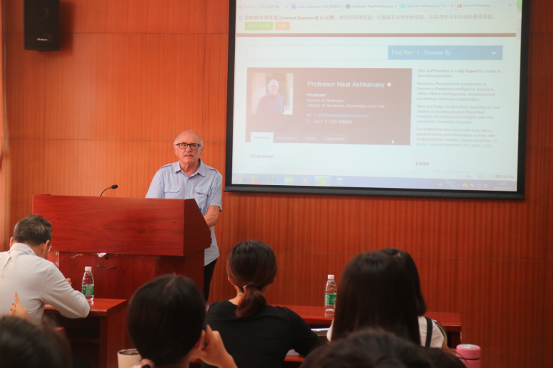 2017 日9月25日下午,澳大利亚昆士兰大学商学院NealAshkanasy 教授与商学院师生分享了“What does it take to become a successful OB scholar”,陈国海、安凡所等教授以及商学院硕士研究生参加了本次学术讲座。讲座由商学院副院长袁登华教授主持。