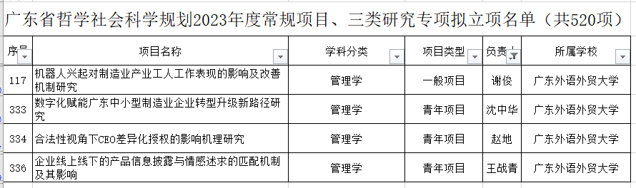 其中,一般项目1项,谢俊教授的《机器人兴起对制造业产业工人工作表现的影响及改善机制研究》。青年项目3项,分别是沈中华老师的《数字化赋能广东中小型制造业企业转型升级新路径研究》,赵地老师的《合法性视角下CEO差异化授权的影响机理研究》,王战青老师的《企业线上线下的产品信息披露与情感述求的匹配机制及其影响》。