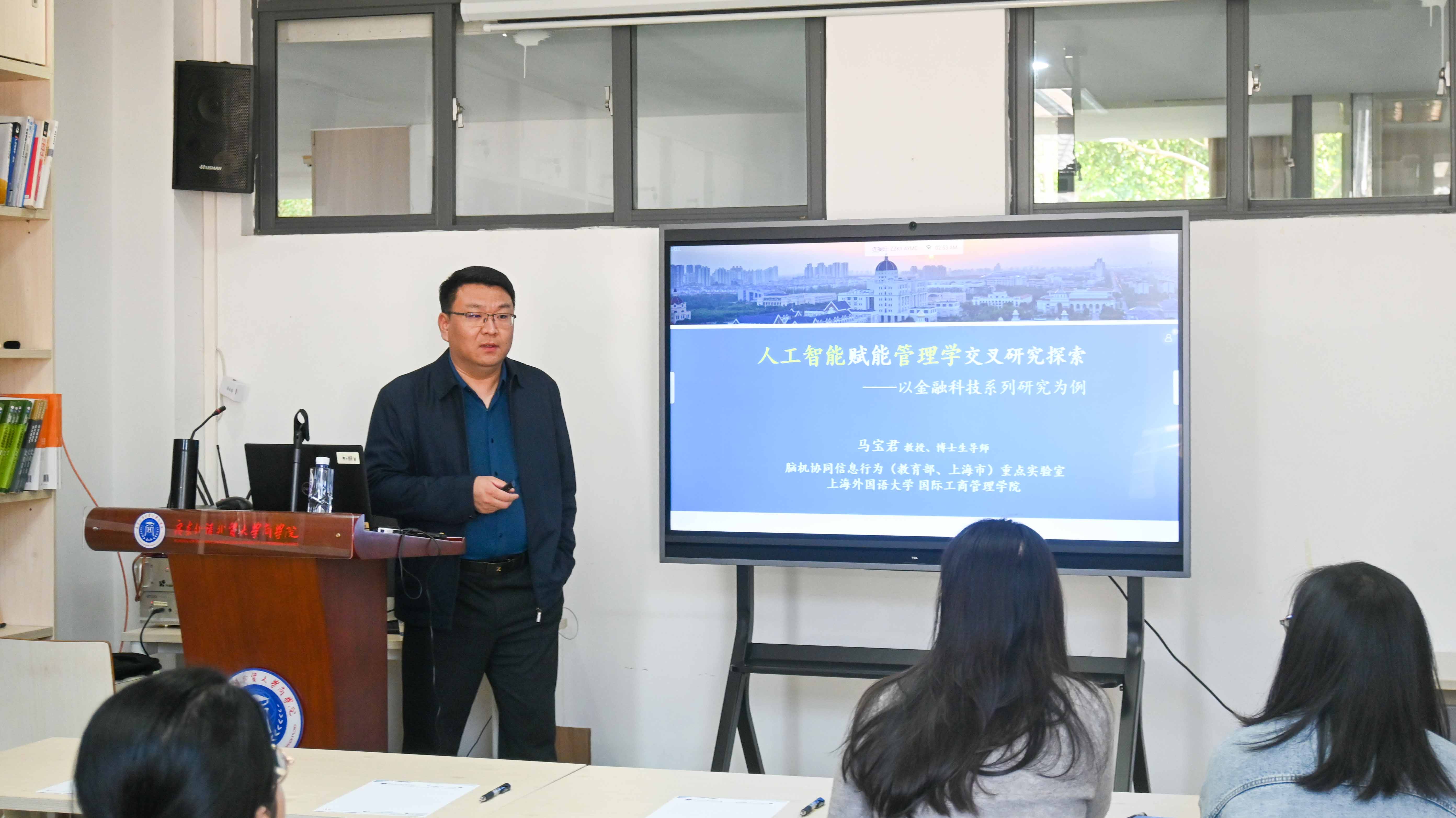 2024年12月13日下午,商学学术论坛第76期如期举行。本期论坛特别邀请了上海外国语大学三级教授、博士生导师马宝君教授,围绕“人工智能赋能管理学研究探索——以金融科技系列研究为例”这一主题进行讲座。讲座由我院研究生办公室副主任孙玉姣主持。