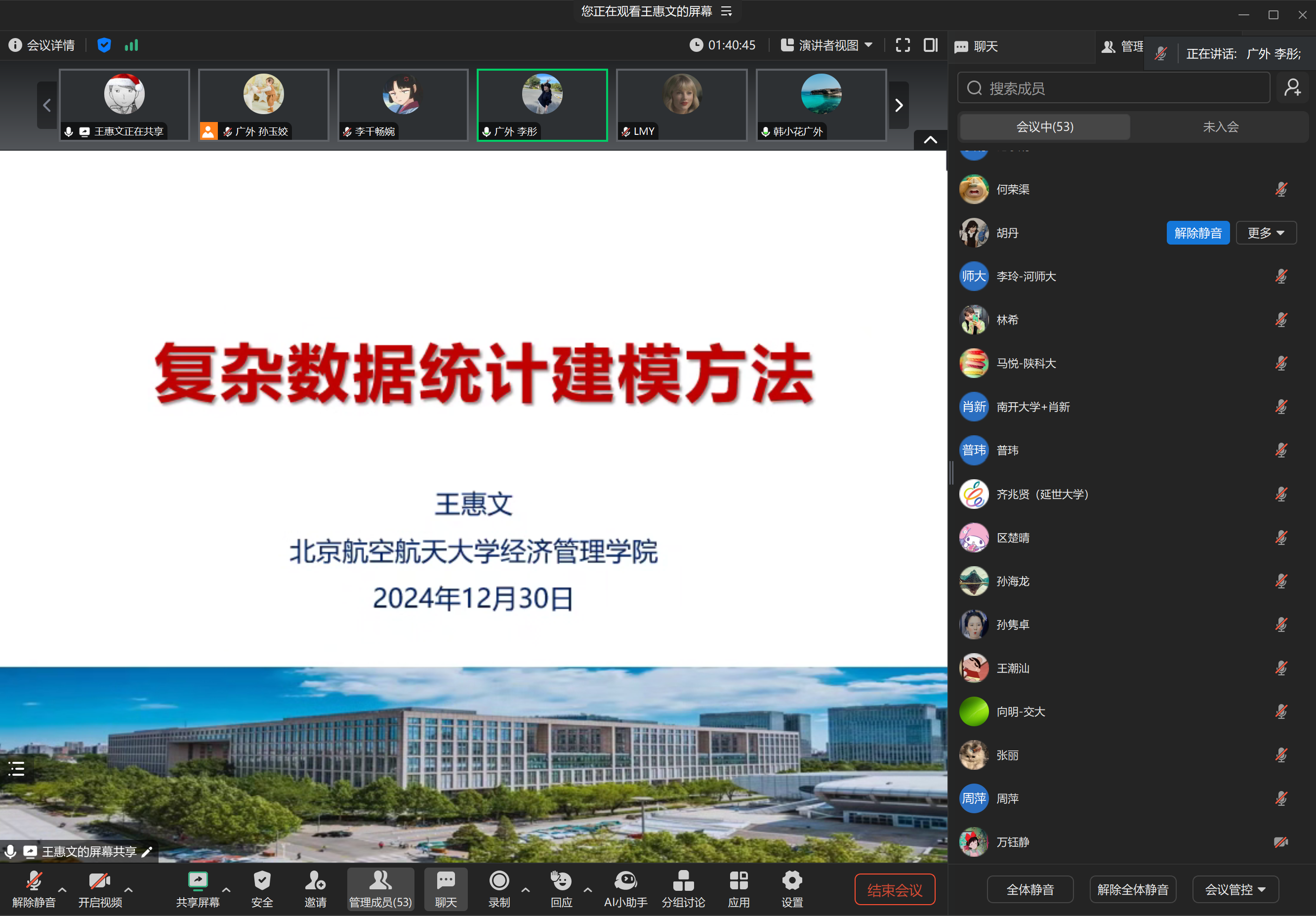 2024年12月30日上午,商学学术论坛第79期如期举行。本期论坛邀请了北京航空航天大学经济管理学院教授、博士生导师王惠文,进行了一场主题为“复杂数据统计建模方法”的线上讲座。会议由学院副院长韩小花主持。