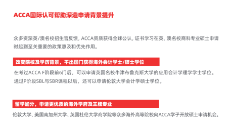 国际财经证书培训项目的课程内容与国外QS前100高校的研究生课程高度契合,拥有国际财会金融证书的学员,研究生阶段可以申请更优质的海外学府及王牌专业。部分证书完成阶段性学习还可以直接不出国门获得海外学士/硕士学位。
