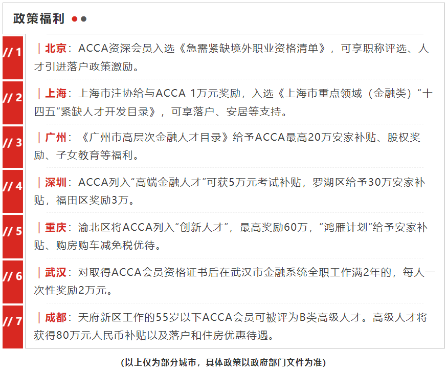 《会计改革与发展“十四五”规划纲要》指出,继续培养符合会计国际交流合作需要的国际化高端会计人才,主要面向央企、国企、上市公司、地方重点企业、行政事业单位、会计师事务所等的财会金融从业者;国际财经证书培训项目内CPA、ACCA、FRM、CMA、CFA、等证书已被北京、广州、深圳、上海、珠海等30个省、市列入高端财会金融紧缺人才引进计划,享受落户政策、安家补贴、购房购车减免税优待等等人才福利。